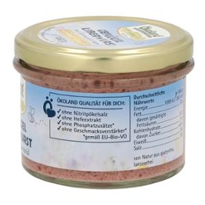 Die Ökoland Geflügel-Leberwurst ist eine Wurst-Spezialität aus reinem hochwertigem Bio-Geflügelfleisch und Bio-Geflügelleber in Gourmet-Qualität. Mit Sonnenblumenöl erhält sie die besonders feine und streichfähige Konsistenz. Die traditionellen Gewürze sorgen gemäß Hausmacher Art für den herzhaft-leckeren Geschmack. Im praktischen Zylinderglas leicht entnehmbar.