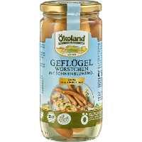 Die Ökoland Geflügel-Würstchen sind aus hochwertigem Bio-Putenfleisch hergestellt, abgerundet mit geschmackvollen Gewürzen. Sie eignen sich besonders als Einlage in Eintöpfen, zu Salaten oder pur mit Senf im Brötchen. Der natürliche Buchenholzrauch gibt den Würstchen eine herzhafte Note. Hochwertiges Bio-Fleisch bedeutet, dass unsere Bio-Bauern konsequent für eine artgerechte Haltung und gesunde Fütterung der Tiere sorgen. Glutenfrei, laktosefrei.